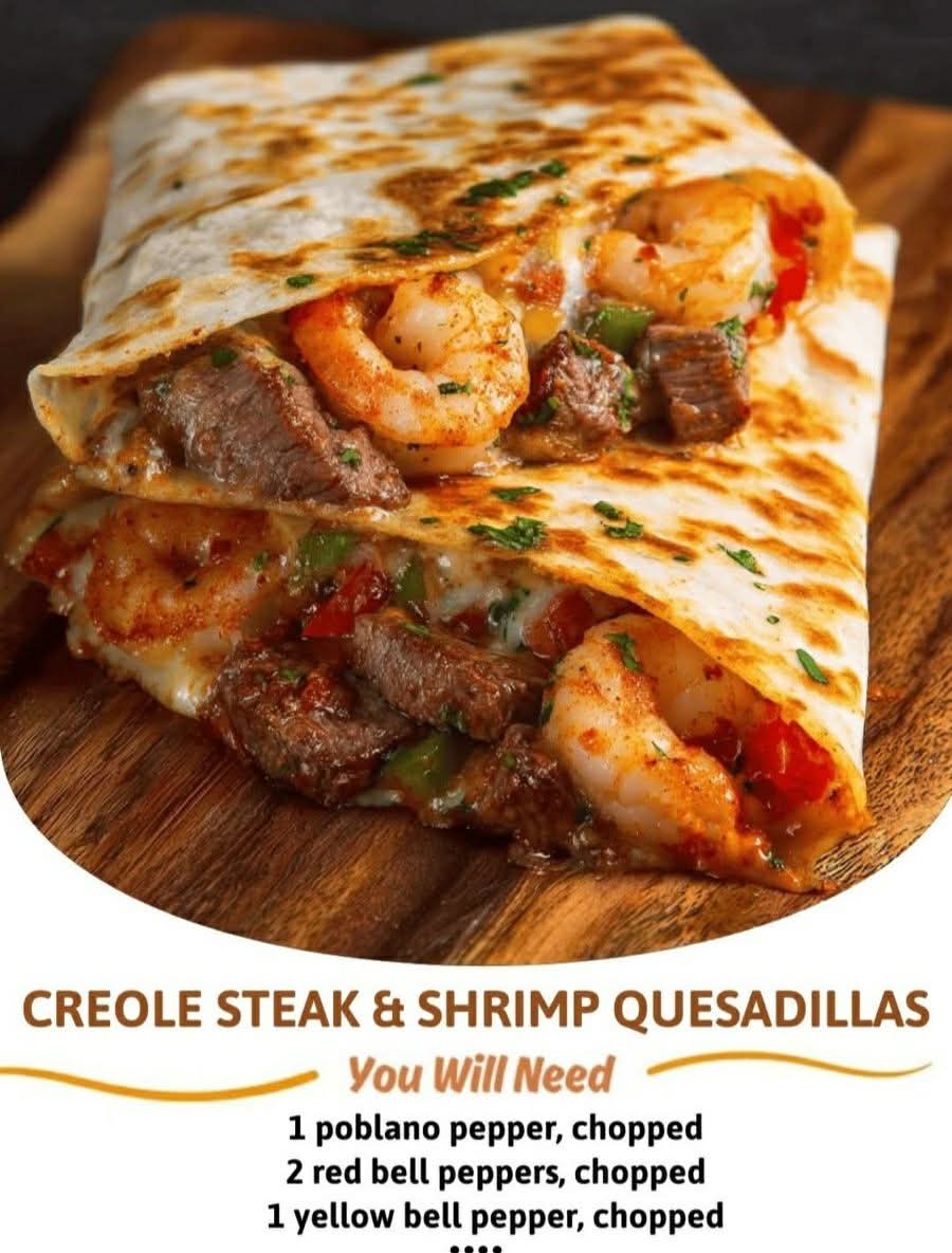 Creole Steak & Shrimp Quesadillas AdminonAugust 30, 2025August 30, 2025Leave a Comment on Creole Steak & Shrimp Quesadillas Creole Steak & Shrimp QuesadillasIngredientsQuesadilla Base2 ribeye steaks, cubed into ¼-inch pieces1.5 lbs shrimp, peeled, deveined, and quartered1 poblano pepper, chopped2 red bell peppers, chopped1 yellow bell pepper, chopped1 large onion, thinly sliced2 cloves garlic, minced2 tbsp olive oil2 tsp Creole seasoning (plus more to taste)Salt & pepper, to tasteAssembly6 large flour tortillas3 cups shredded Mexican blend cheese (or Monterey Jack + Cheddar)2 tbsp butter (for toasting quesadillas)Sour cream, salsa, or guacamole (for serving)—Instructions1. Prepare the Steak & ShrimpHeat 1 tbsp olive oil in a large skillet over medium-high heat.Add cubed ribeye, season with 1 tsp Creole seasoning, and cook until browned but still juicy (about 3–4 minutes). Remove and set aside.In the same pan, add shrimp with a little more oil, 1 tsp Creole seasoning, and cook just until pink (2–3 minutes). Remove and set aside.2. Cook the VeggiesAdd remaining oil to the skillet.Toss in onion, peppers, and garlic. Sauté until softened and slightly charred, about 6–7 minutes.3. Combine FillingReturn steak and shrimp to the skillet with the veggies.Toss everything together, check seasoning, and cook 1–2 more minutes. Remove from heat.4. Assemble QuesadillasLay a tortilla flat, sprinkle a layer of cheese, add steak-shrimp-veggie mixture, then top with more cheese.Place another tortilla on top (or fold in half if using one).5. Cook QuesadillasHeat a clean skillet or griddle with butter over medium heat.Toast each quesadilla for 2–3 minutes per side until golden brown and cheese is melted.6. ServeSlice into wedges, serve hot with sour cream, salsa, or guacamole.